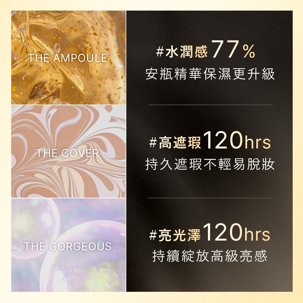富含超高77%比例精華成分,上妝瞬間能感受細膩的水潤貼合。
