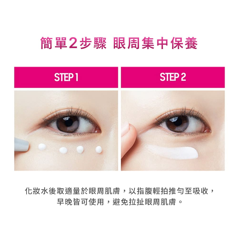 4.以指腹輕輕拍打按壓至吸收,切勿用力拉扯眼周肌膚。