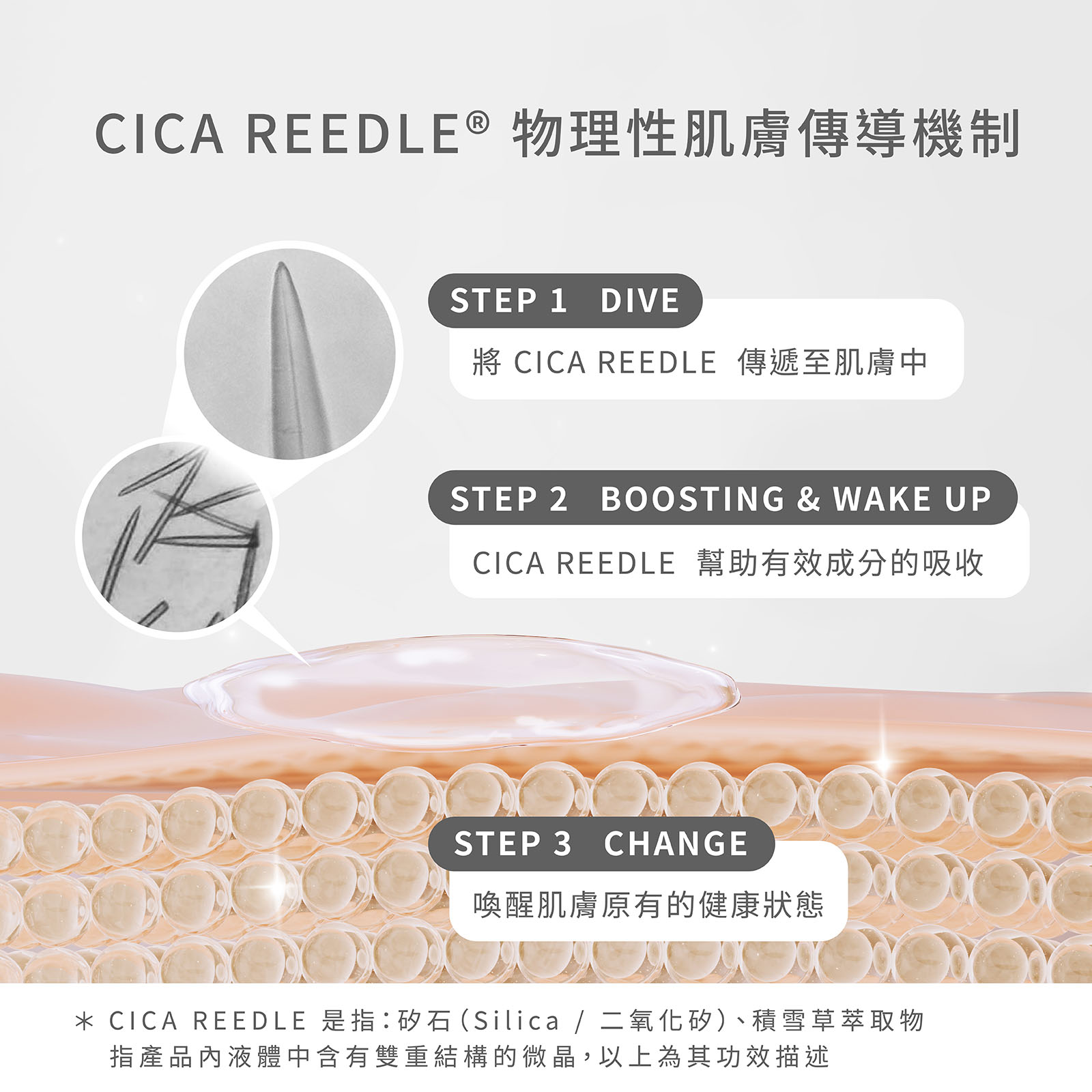 CICA REEDLE®物理真皮輸送系統,打造深入肌底保養新革命!經過多項人體適用評估,CICA REEDLE®以二氧化矽與積雪草萃取物為基底,溫和注入肌膚深層,讓有效成分直達核心,並同步釋放積雪草的鎮靜力量。